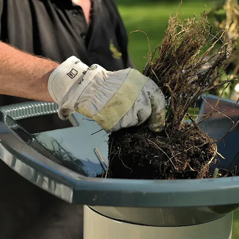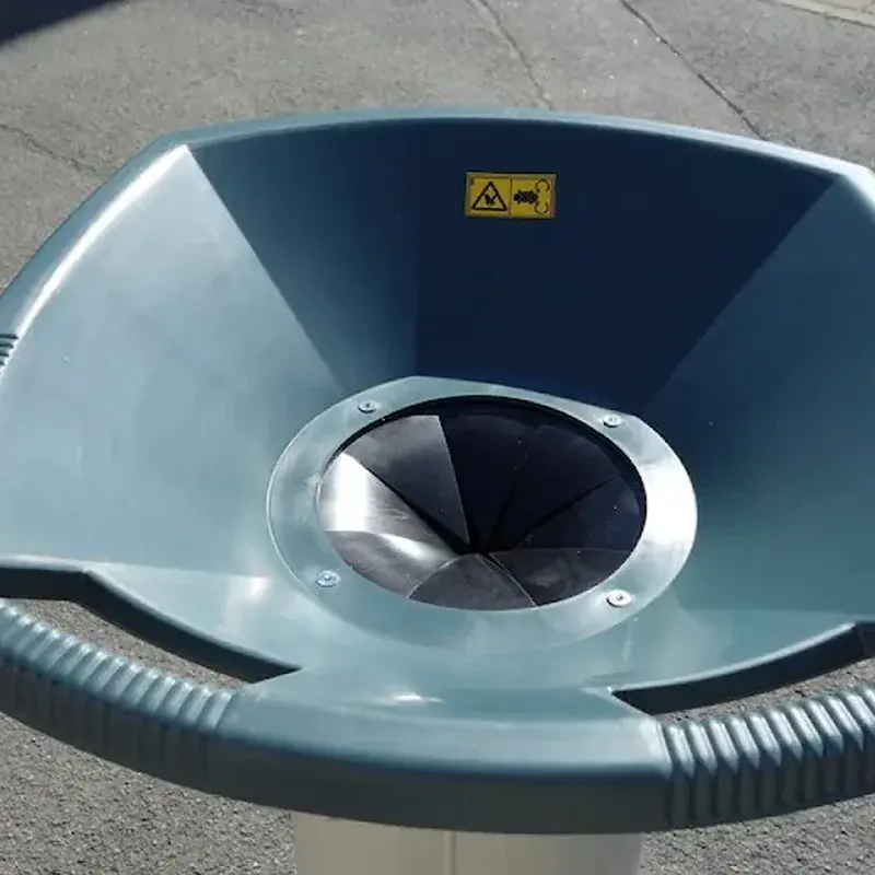 Возможна боковая и верхняя загрузка, чтобы подготовить отходы для различных нужд. Упрощенная подача материала возможно благодаря загрузочной воронке большого диаметра. Колеса и ручка на корпусе облегчает перемещение.