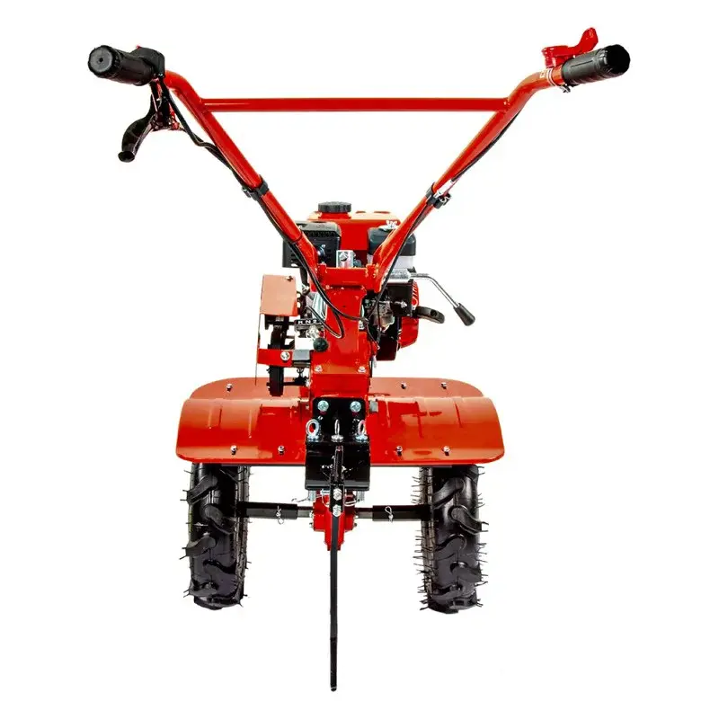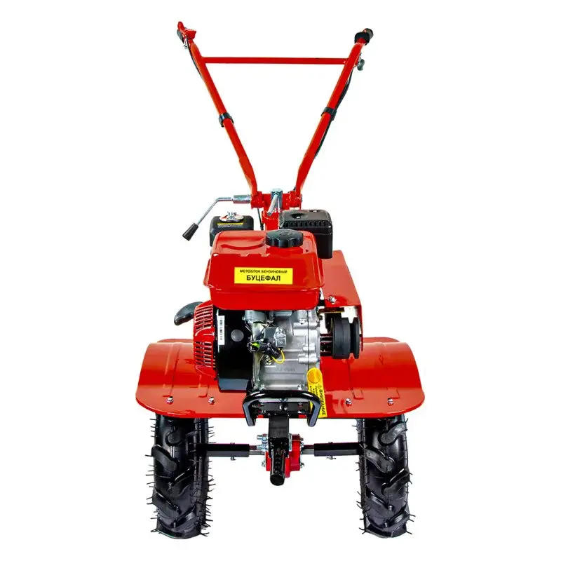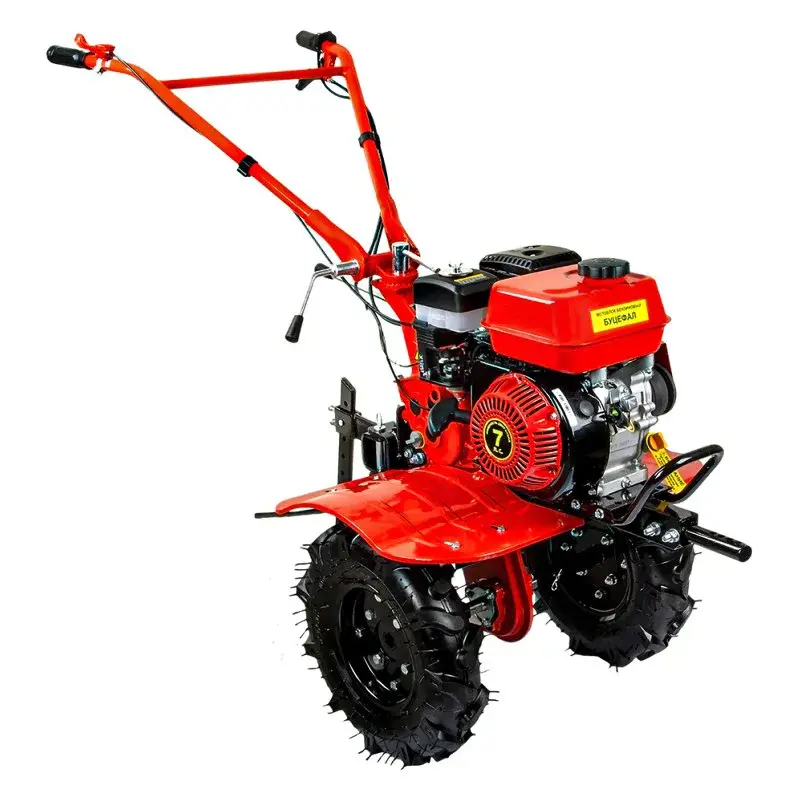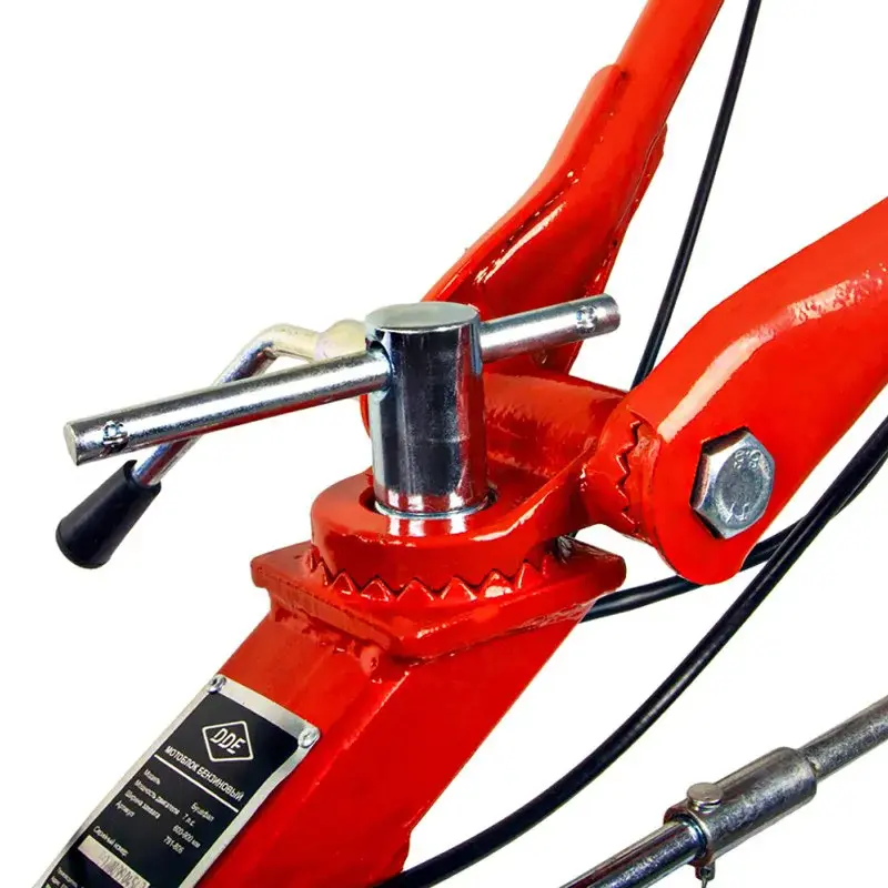 Бензиновый мотоблок оснащен сцепкой с тремя пальцами в комплекте. В передней части расположена сервисная рукоятка. Она нужна для удобной смены навесного оборудования. Мотоплуг обладает прочной конструкцией. Металлические шайбы изготовлены из металла и надежно защищают сальники редуктора от повреждений. Шкивы и трансмиссия с ременно-цепной передачей выполнены из чугуна.