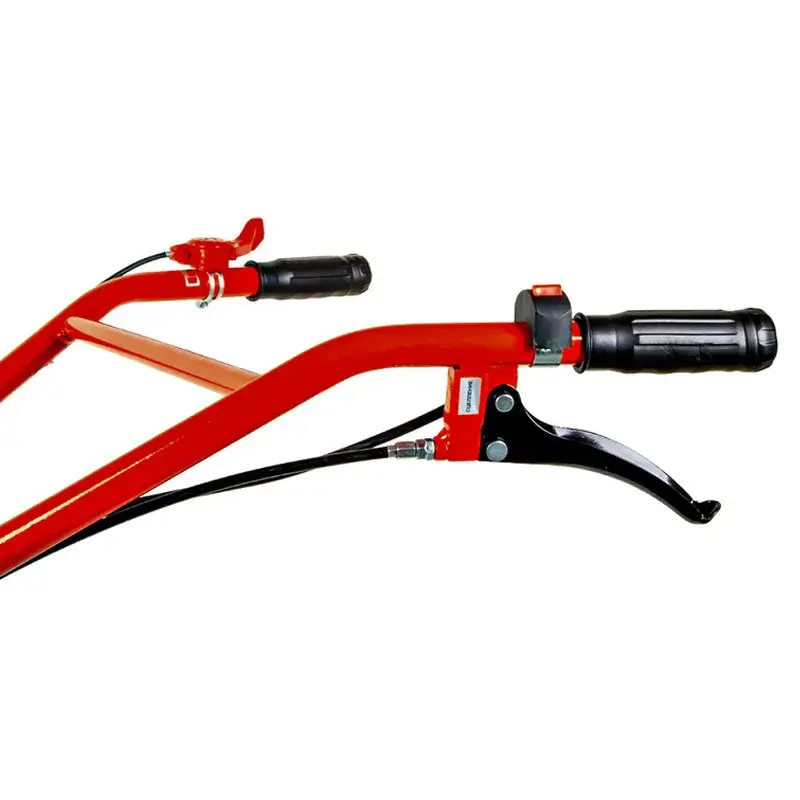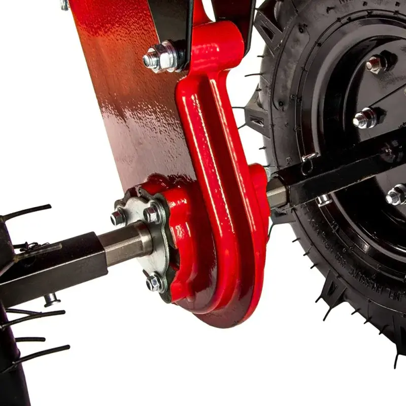 Над каждый колесом расположено широкое защитное крыло. Оно ограждает вас от комков грязи и частичек растительности. Руль регулируется в вертикальной и горизонтальной плоскостях. На его держателях есть накладки из нескользящего материала. Они обеспечивают надежный хват при управлении мотоблоком.