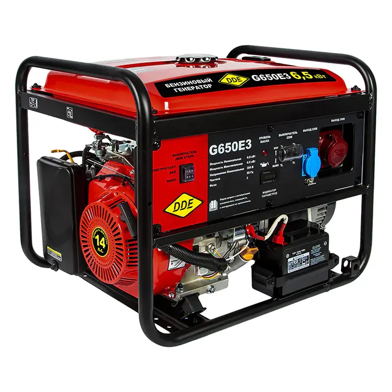 Бензиновый генератор DDE G650E3 с максимальной мощностью 6,5 кВт предназначен для питания однофазных потребителей или трехфазной техники. Предусмотрен электростартер, который позволяет запускать двигатель одним нажатием кнопки.