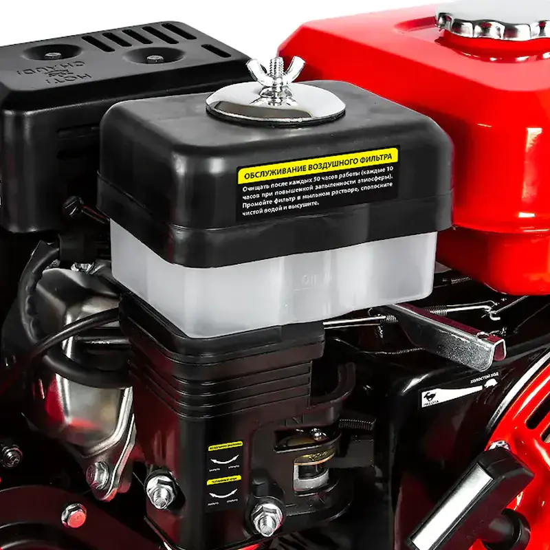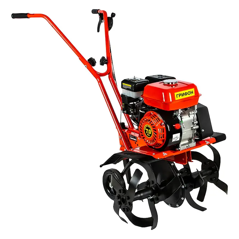 Бензиновый культиватор движется вперед за счет вращения фрез. Колеса имеют два рабочих положения. Они облегчают транспортировку к месту вспашки, а также служат в качестве дополнительной опоры во время перемещения по участку. Рычаг управления дроссельной заслонкой, удобно расположенный на правой рукоятке, позволяет регулировать частоту оборотов двигателя. Мотокультиватор срезает верхний слой почвы или дерна, помогая избавиться от сорняков и тщательно вскопать огород. Глубина обработки регулируется с помощью сошника.