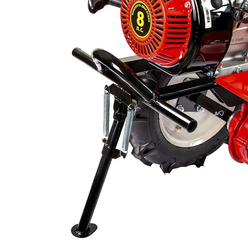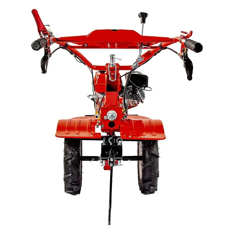 Бензиновый мотоблок оборудован рулем, который можно установить на нужный уровень высоты. Для удобства управления на рукоятках расположены рычаги сцепления, реверса, газа, переключения скоростей и зажигания. Включение заднего хода обеспечивает маневренность мотоблока. Глубину вспашки легко регулировать путем перемещения сошника вверх-вниз. Продолжительная работа без дозаправки гарантирована благодаря вместительному топливному баку.