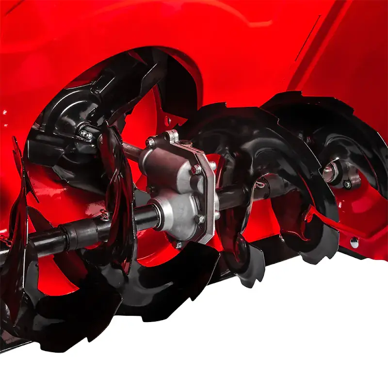 Чтобы повышенная нагрузка на шнек при расчистке мокрого и тяжелого снега не привела к поломке снегоуборщика, в его конструкции предусмотрена защита. При перегрузке срезаются только болты, фиксирующие шнек на приводном валу, вращение прекращается, все узлы и механизмы остаются целыми. В держателях на ковше закреплена лопатка для устранения засора желоба.