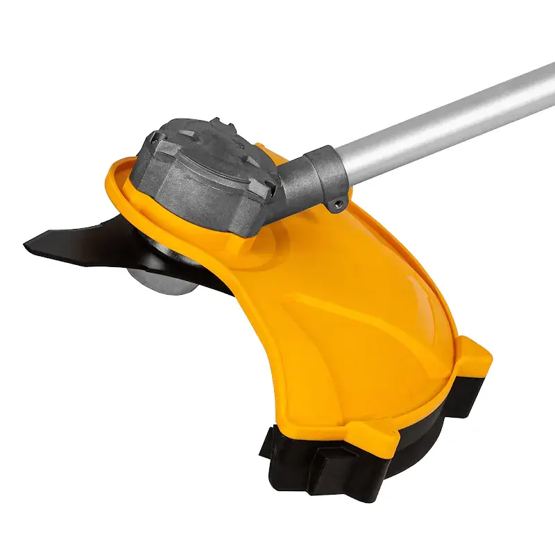 Инструмент не требует длительной подготовки к работе. Установите заряженные аккумуляторы и нажмите кнопку запуска. Двигатель плавно набирает обороты, без стартовых рывков. Конструкция аккумуляторного триммера DENZEL с прямой штангой и велосипедной рукояткой позволяет совершать размашистые движения по дуге как при работе обычной косой, что значительно повышает производительность работ. Функция реверса двигателя запускает вращение оснастки в обратную сторону и автоматически выключается через 2 секунды. Это действие позволяет избавиться от травы, намотанной на вал.