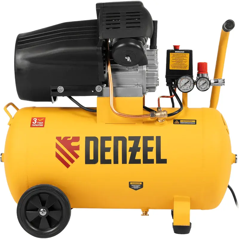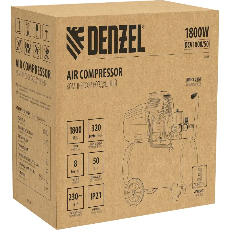 Воздушный компрессор с прямым приводом Denzel DCV1800/50 58168 мощностью 1,8 кВт и производительностью на входе 320 л/мин, с объемом ресивера 50 л, подходит для обеспечения длительной работы пневмогайковерта, пневмозубила, пневмодрели, пневмомолотка или другого пневмоинструмента. Быстроразъемные коннекторы Рапид (Евро) облегчают подключение пневмомагистралей. Эффективная система смазки снижает износ деталей и уменьшает нагрузку на двигатель, что позволяет использовать компрессор в профессиональной сфере.