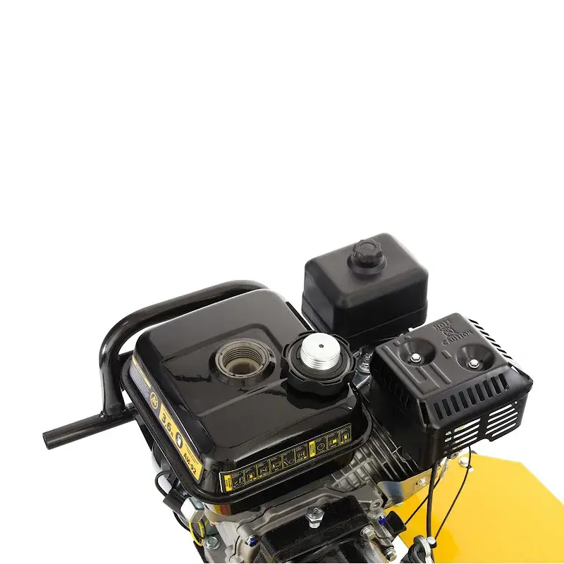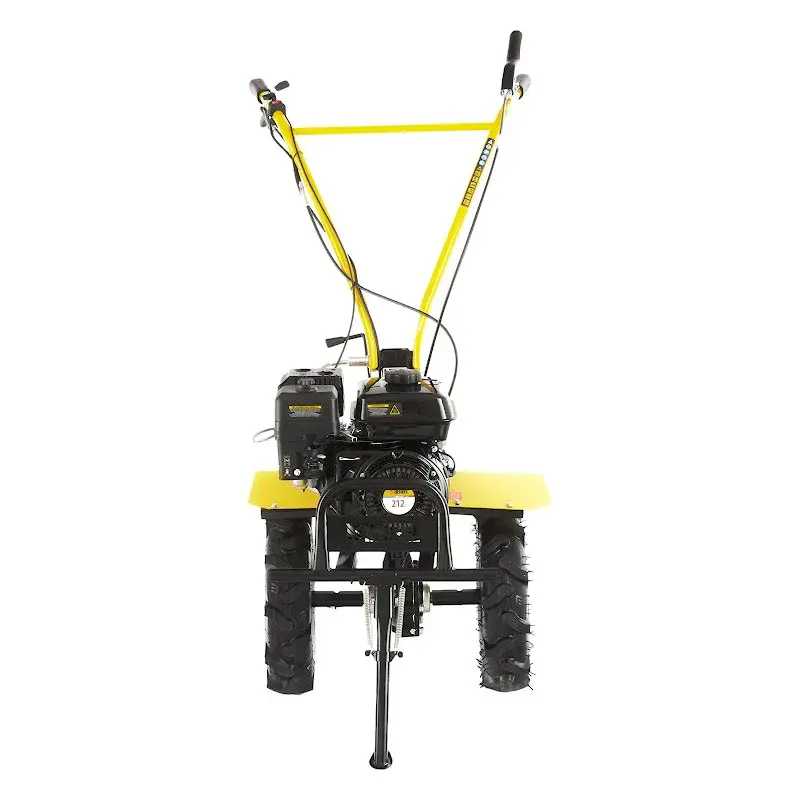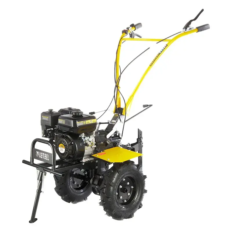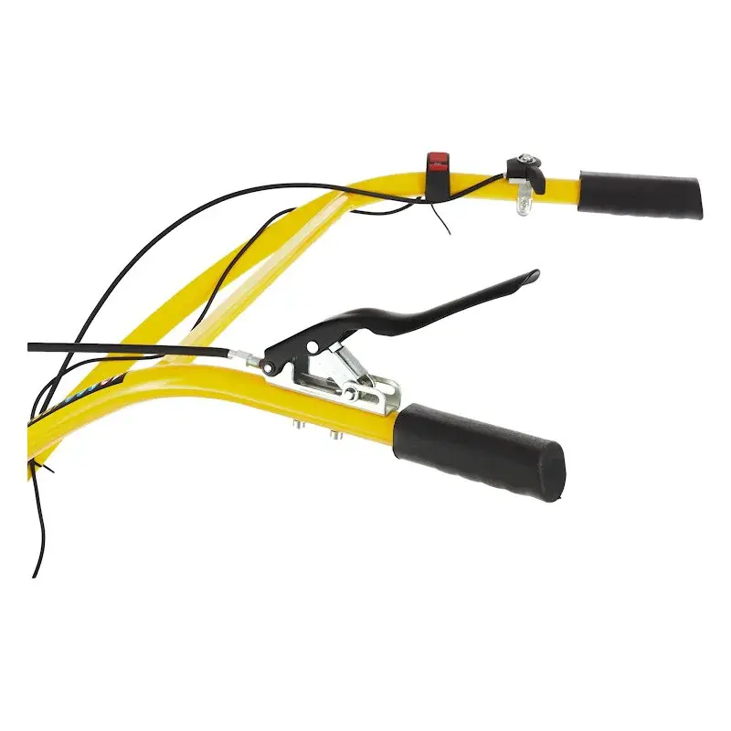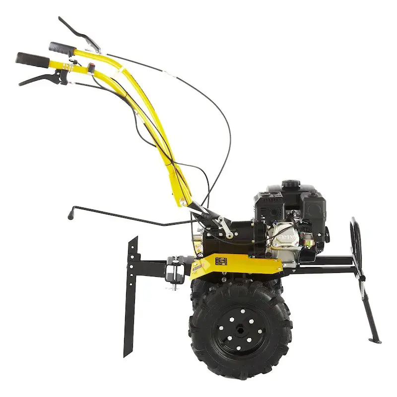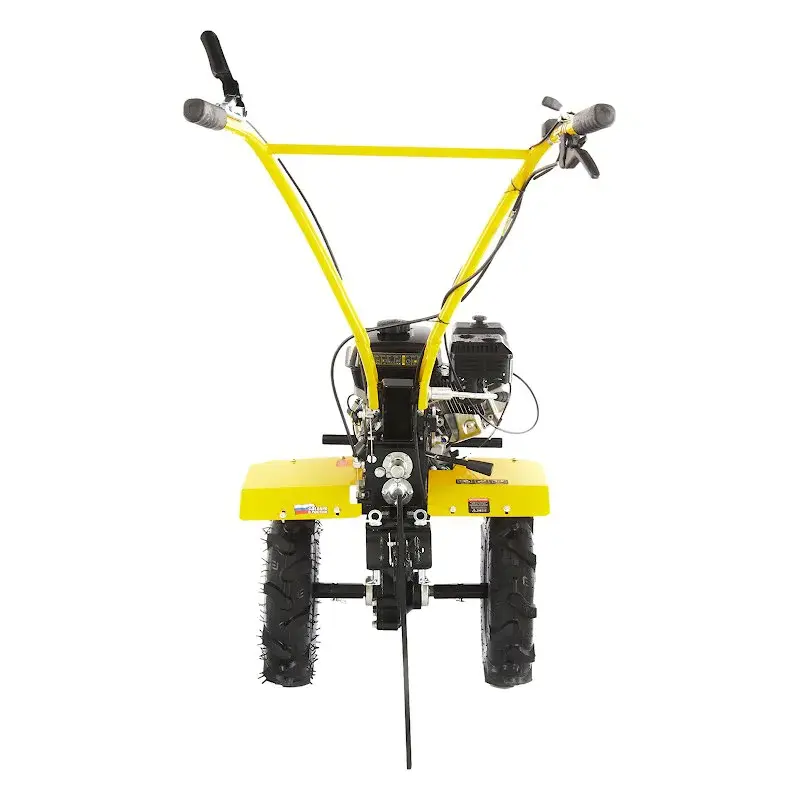 На регулируемой по высоте рулевой рукоятке бензинового мотоблока находятся основные элементы управления: регулятор оборотов двигателя, сцепление и реверс. Выключатель зажигания удобно расположен под правой рукой, что позволяет мгновенно заглушить двигатель в экстренной ситуации. Культивирование целины и тяжелых глинистых почв рекомендуется на первой скорости; рыхлой и ранее вспаханной земли — на второй. Задний ход облегчает маневрирование и вытаскивание застрявшей в земле машины. Глубина вспашки регулируется установкой высоты сошника.