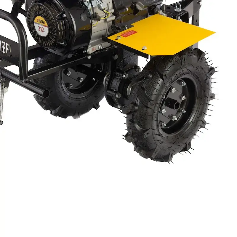 Мотоблок DENZEL DPT-270X оснащен системой защиты, которая контролирует уровень моторного масла и срабатывает при его снижении. Глубокие протекторы колес гарантируют хорошую устойчивость и проходимость. Нескользящие прорезиненные рукоятки обеспечивают крепкое и надежное удержание машины во время работы. Защитные крылья оберегают оператора от вылетающих из-под фрезы комьев земли и камней. Бампер с рукояткой поможет при транспортировке. Благодаря складной передней опоре обеспечивается устойчивое положение мотоблока, в котором удобно и безопасно проводить техническое обслуживание и менять навесное оборудование.
