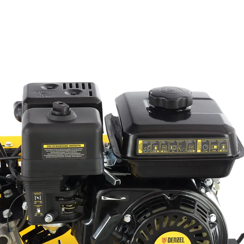 Мотоблок DENZEL DPT-270X, оборудованный двигателем мощностью 7 л.с. и шестеренчатым редуктором в чугунном корпусе, отличается высокой производительностью и проходимостью. Машина имеет универсальный механизм сцепки, позволяющий присоединять различное навесное оборудование: косилки, бороны, окучники, прицепы и прочее. Ширина обработки составляет 90 см.
