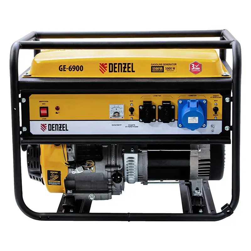 Все розетки бензогенератора Denzel GE-6900 оснащены предохранителями, которые защищают от короткого замыкания. Помимо этого, при резком скачке напряжения срабатывает автоматическое отключение. Это предотвращает поломку самого генератора, а также подключенных к нему потребителей.