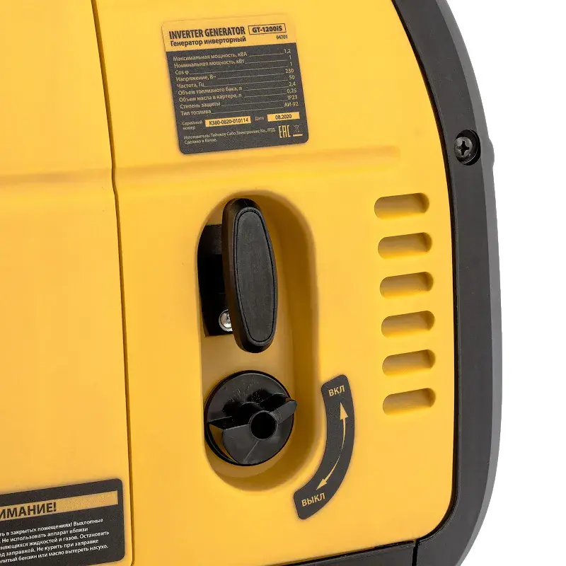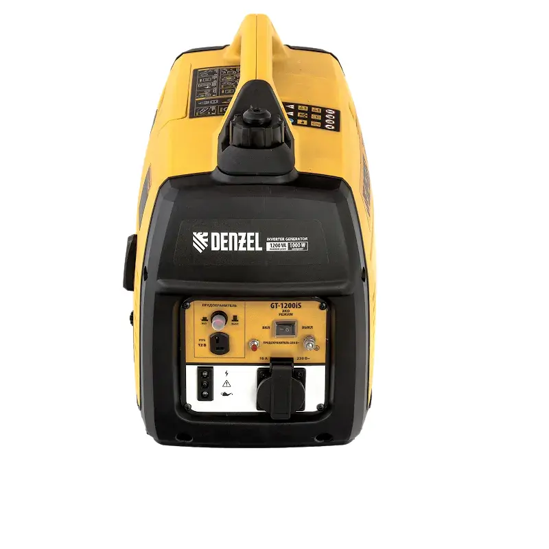 Двигатель автоматически останавливается по достижении критически низкого уровня масла. В случае перегрузки по току и срабатывания автоматического предохранителя выработка электроэнергии прекращается во избежание повреждения подключенных к генератору DENZEL GT-1200iS устройств.