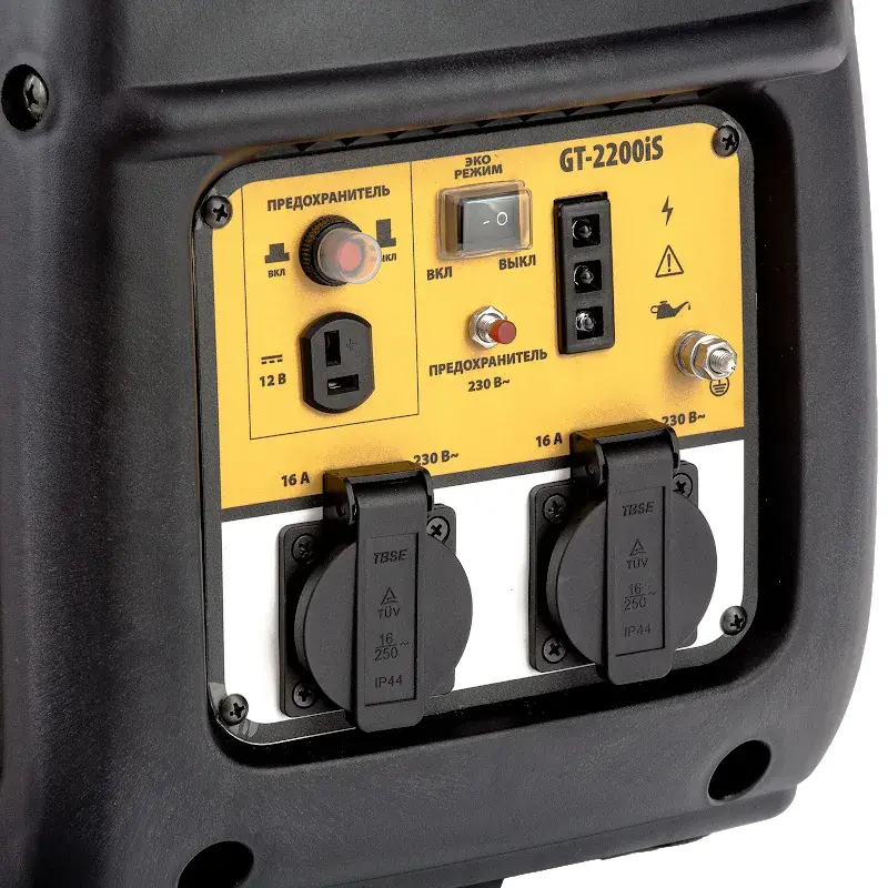 Благодаря экономичному двигателю с электронной системой регулировки оборотов одной заправки топливного бака хватает почти на 5 ч работы. Лицевая панель оснащена двумя розетками 230 В переменного тока для подключения бытовой техники, электронной аппаратуры или электроинструментов. Выход постоянного тока предназначен для подзарядки 12-вольтовых аккумуляторных батарей.