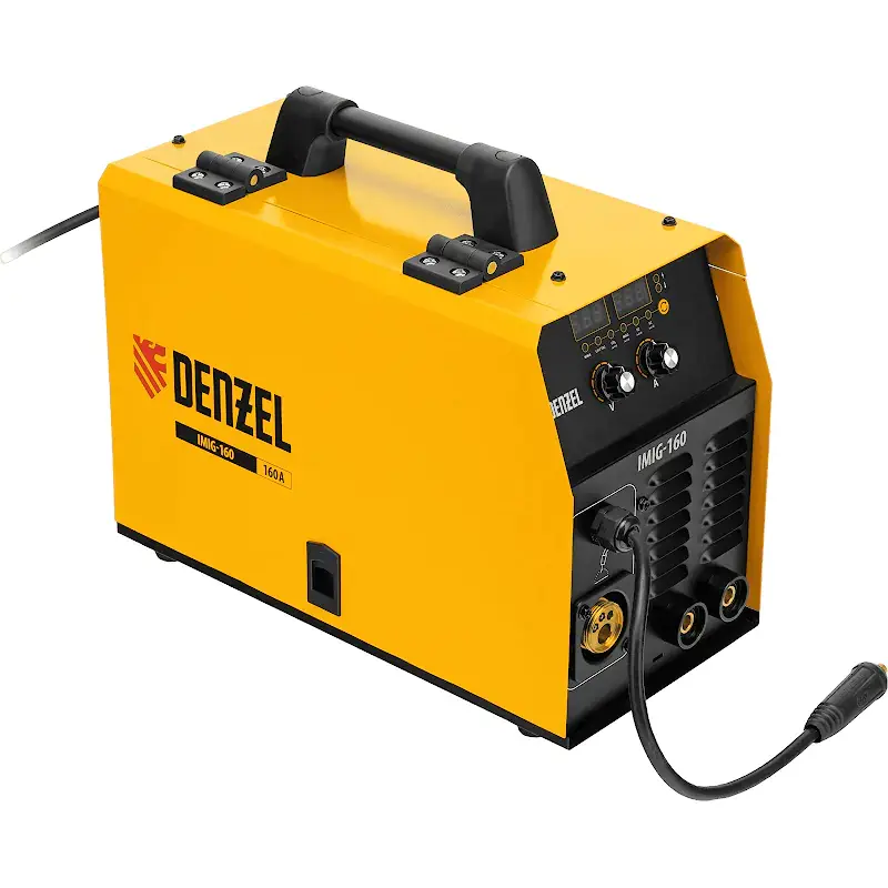 Инверторный аппарат полуавтоматической сварки Denzel IMIG-160 работает со сварочным током до 160 А, характеризуется продолжительностью включения 60% и совместим с катушками до 5 кг. Используется для сварки углеродистых и нержавеющих сталей с использованием постоянного тока. Эффективен для работы с тонкостенными заготовками.