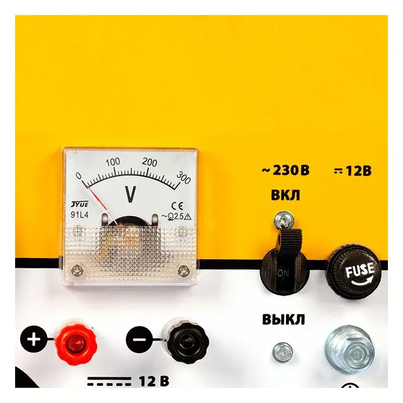 Для подключения техники на корпусе бензинового электрогенератора расположено две розетки 230 В. Выходы оснащены защитными крышками, которые плотно закрываются и не допускают попадания пыли, грязи или влаги внутрь. Рядом с розетками расположен вольтметр для отслеживания текущего напряжения. Для подзарядки севшего автомобильного аккумулятора предусмотрен выход на 12 В.