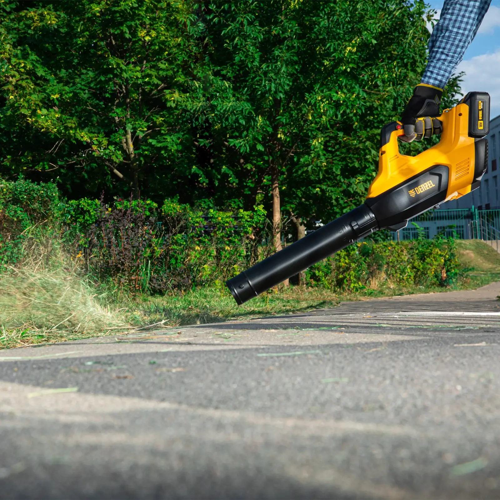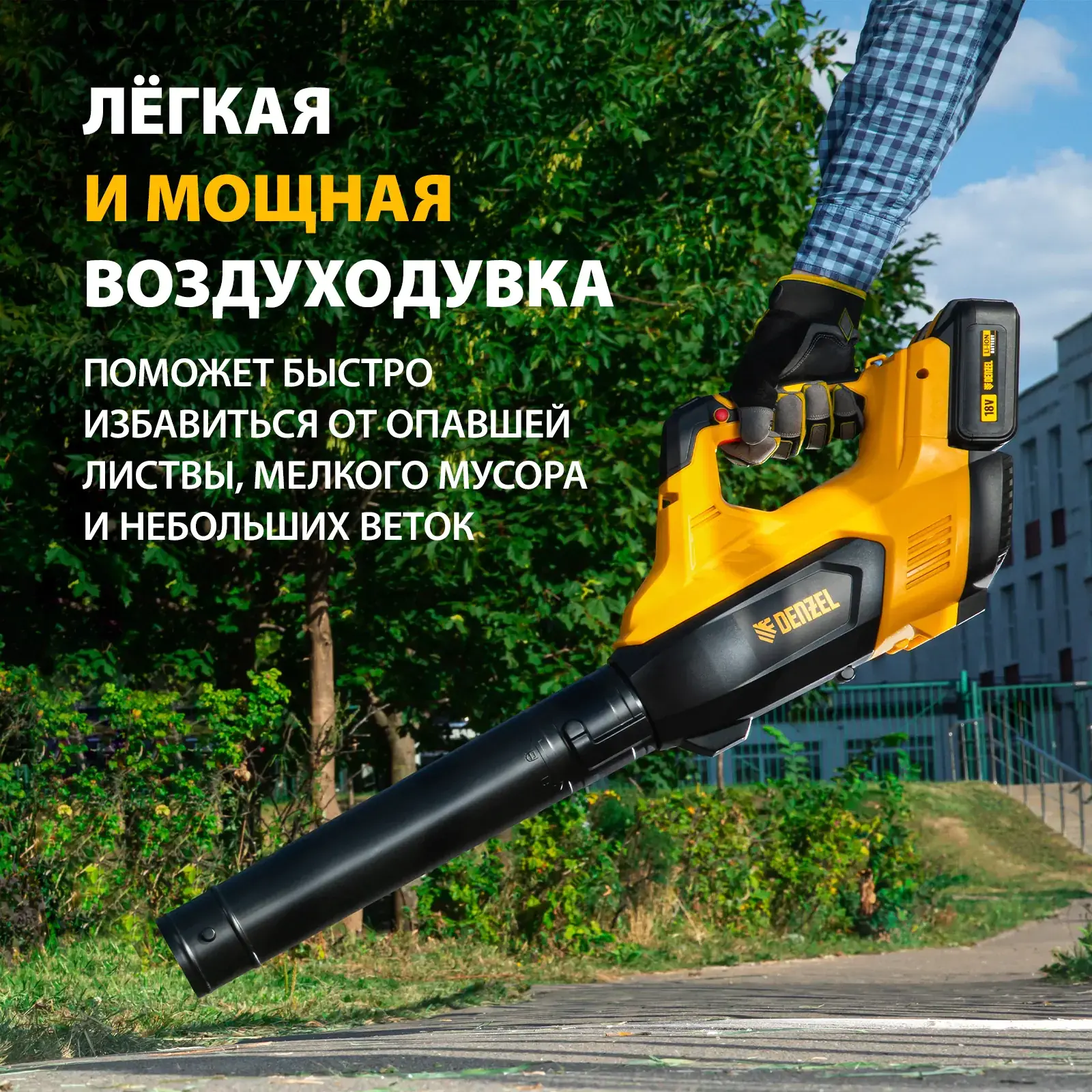 Аккумуляторная воздуходувка DENZEL RB180-36 используется для очистки придомовой территории от сухой листвы, травы, опилок или другого мусора. Инструмент работает от двух аккумуляторов 18 В, создает мощный воздушный поток для быстрой и эффективной уборки.