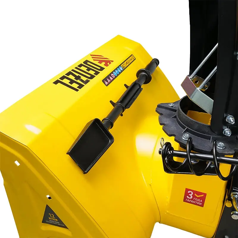 Переработанные снежные массы выбрасываются через желоб. Его поворот настраивается вручную. За счет этого на уже очищенной территории не будут забрасываться снегом.