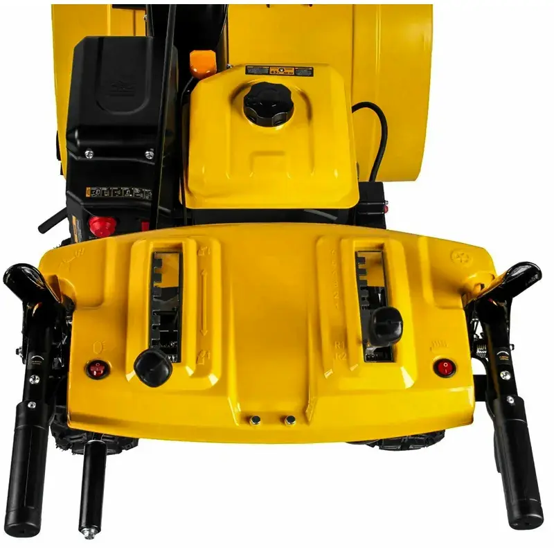 На ковше расположены направляющие лыжи. Их положение настраивается вручную, что позволяет определять расстояние между очищаемой поверхностью и кожухом шнека. Если опустить направляющие лыжи вниз, то ковш приподнимется и не заденет декоративную дорожку под сугробами. А если поднять их наверх, то модель захватит максимальный слой снега у самой земли для более глубокой очистки.