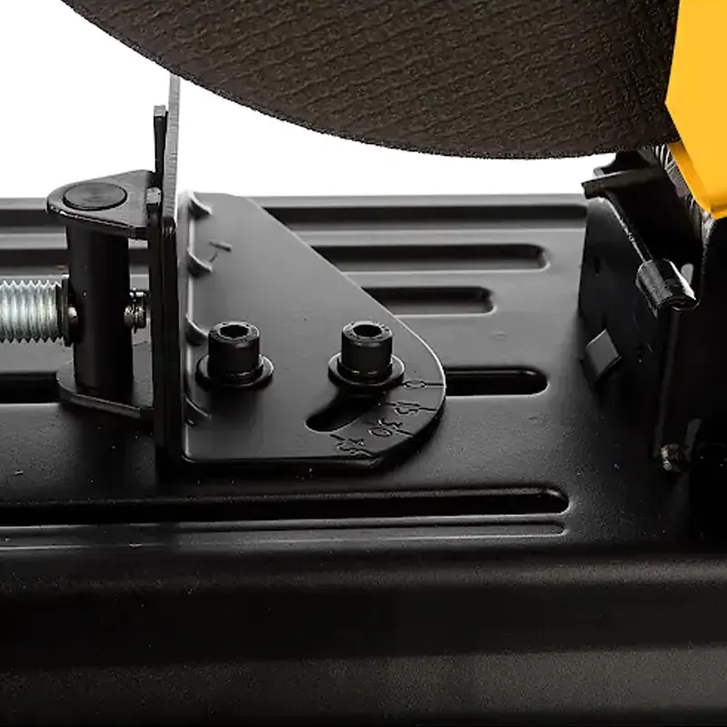 Пилу DeWalt D28730 можно зафиксировать в сложенном положении для безопасной переноски. Для защиты во время работы предусмотрена регулировка искрозащитного щитка. На пусковом выключателе имеется отверстие для установки навесного замка для предотвращения несанкционированного использования инструмента. Направляющую можно отрегулировать, выставив нужный угол реза или изменив зазор между ней и тисками.