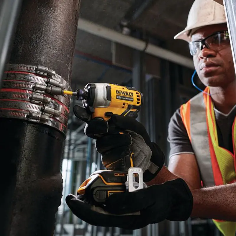 Кнопка реверса на корпусе шуруповерта DeWalt DCF809N включает вращение оснастки в обратную сторону для вывинчивания саморезов. Инструмент можно подвешивать на пояс за боковую скобу и носить с собой, чтобы он всегда был под рукой.