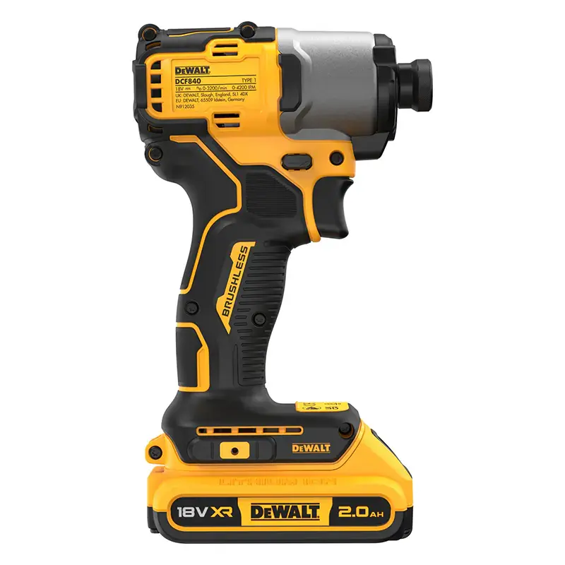 Бесключевой подпружиненный шестигранный патрон 1/4HEX с автоматической фиксацией позволяет быстро менять насадки. Шуруповерт DeWalt DCF840D2T производит ударно-вращательное действие. Тангенциальные удары наносятся перпендикулярно оси вращения по касательной к крепежу, поэтому инструмент подходит для закручивания саморезов на значительную глубину даже в твердые породы дерева, обеспечивает прочность и надежность резьбовых соединений. Функция реверса меняет направления вращения оснастки.