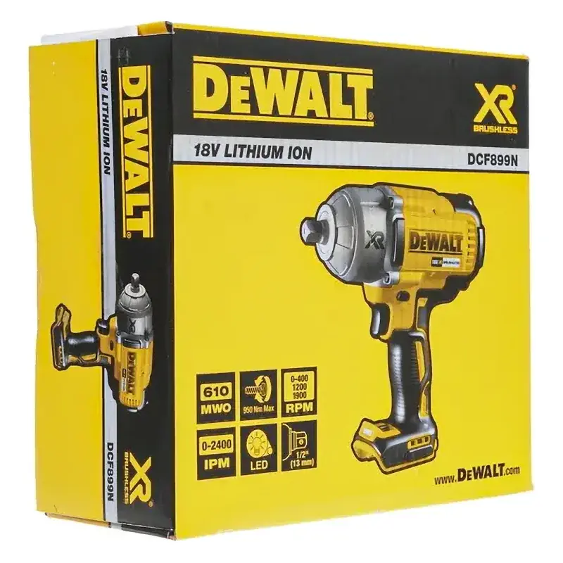 Импульсный гайковерт DeWALT DCF899N выдает 2400 уд/мин и обеспечивает крутящий момент до 950 Нм, что подойдет для работы в автосервисе или ремонта техники. Высокий максимальный крутящий момент 1625 Нм позволит откручивать гайки, которые туго затянуты или окислившейся крепеж.