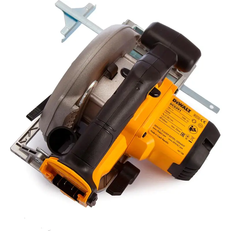 Аккумуляторная дисковая пила DeWalt снабжена полезными функциями, необходимыми для удобства работы. Скорость оборотов регулируется силой нажатия на пусковой выключатель. При его отпускании вращение сразу прекращается благодаря электронному тормозу двигателя. Регулировка угла наклона диска и глубины реза выполняется с помощью удобных рукояток, без применения специальных инструментов. Четкая шкала позволяет установить точное значение. Входящая в комплект поставки направляющая облегчает продольный распил доски на узкие рейки.