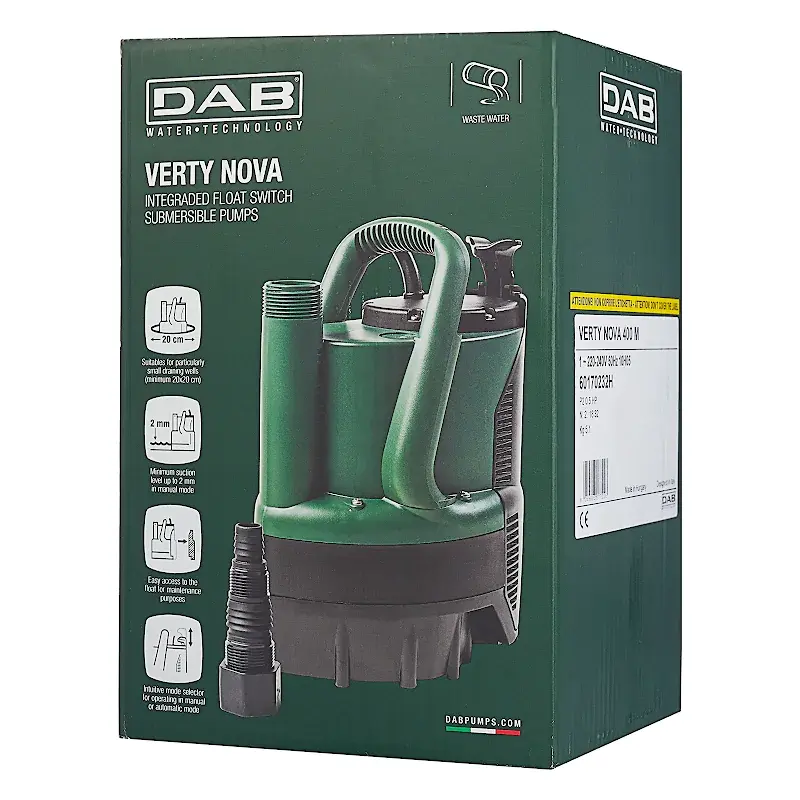 Дренажный насос DAB VERTY NOVA 200 M отличается компактностью и надежностью. Предназначен для перекачивания чистой воды, содержащей твердые частицы размером до 5 мм. Подходит для применения в узких колодцах размером 20х20 см. Охлаждение двигателя позволяет насосу работать даже при его частичном погружении. Модель способна всасывать до 2-3 мм.