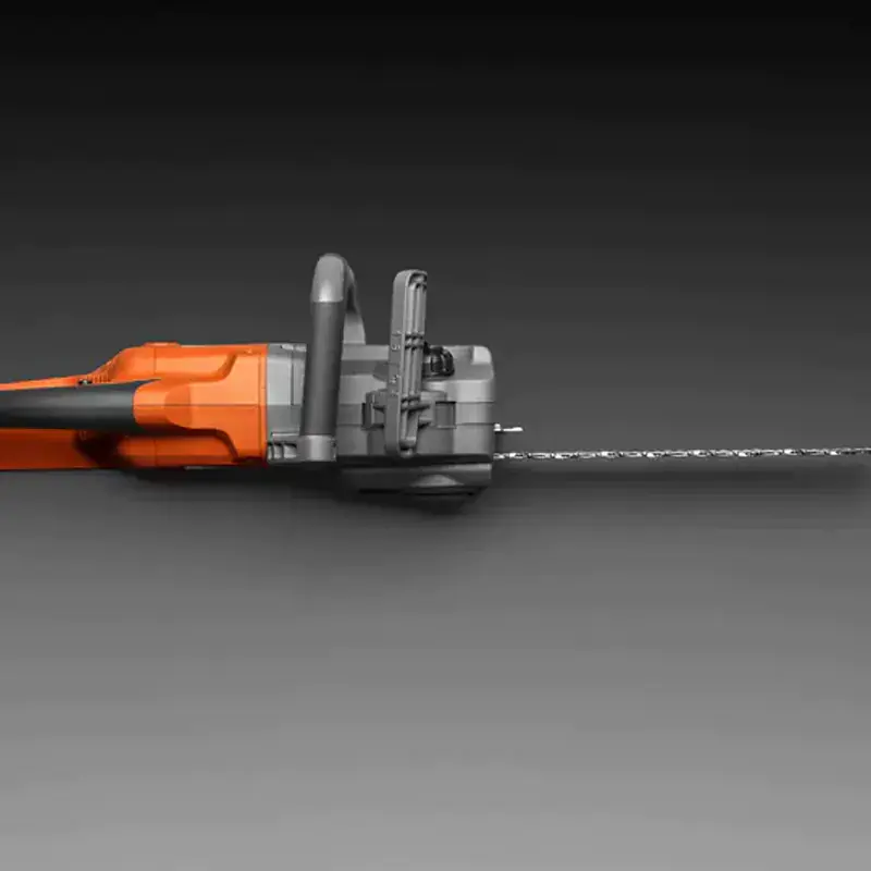 Компактная и маневренная, пила практически не создает шума и заводится с одной кнопки — эргономичность модели продумана до мелочей европейскими инженерами. Узкий корпус из гладкого пластика приятно лежит в руках, вес 4,7 кг и центр тяжести аккуратно сбалансированы. Двигатель расположен продольно, поэтому ширина устройства всего 24 см. Таким удобно работать в разных плоскостях и местах с затрудненным доступом, куда громоздкая бензопила не пролезет.