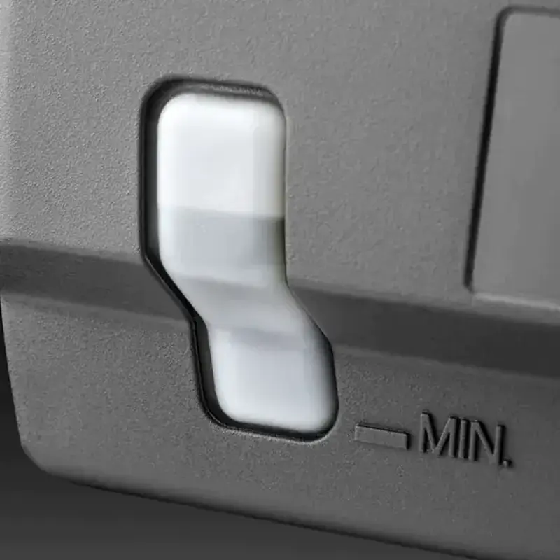 - Индикатор уровня масла. Прозрачное окно бака позволяет сразу проверить уровень масла.