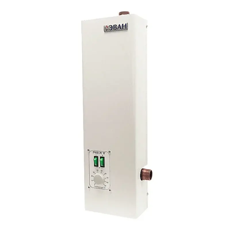 Встроенный термостат регулирует температуру в отопительном контуре. При достижении заданных значений, питание электрокотла ЭВАН NEXT-14 прекращается, пока вода не остынет на несколько градусов. Затем двигатель запускается заново. За счет этого экономится электричество, т.к. котел не работает постоянно, а лишь поддерживает температуру.