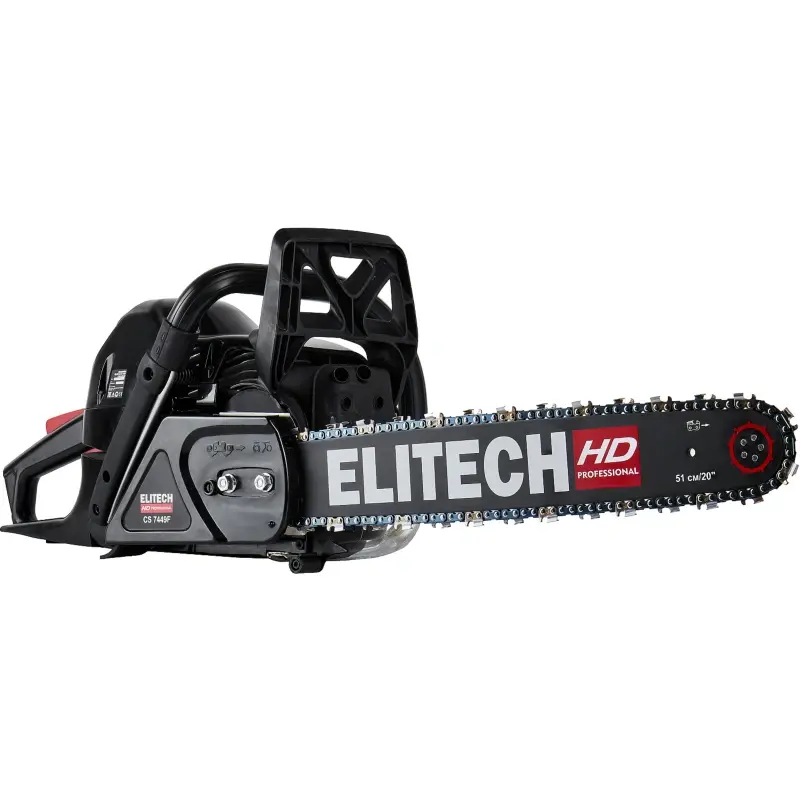 Цепная пила бензиновая ELITECH HD CS 7449F с двигателем мощностью 4,9 л.с. предназначена для пиления древесины вне помещений, на открытом воздухе.