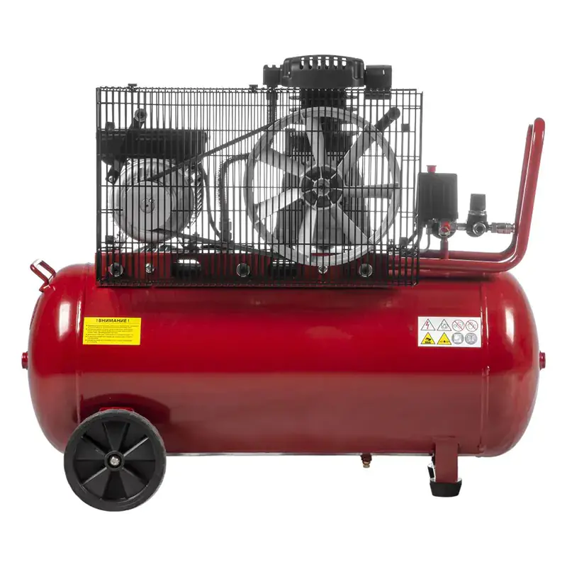 Ременной компрессор ELITECH КПР 100/360/2.2 легко перемещать по рабочей площадке. Для этого он оснащен парой колес и длинной транспортировочной рукояткой. А для устойчивого положения во время использования у него есть передняя опора с двумя виброгасителями.