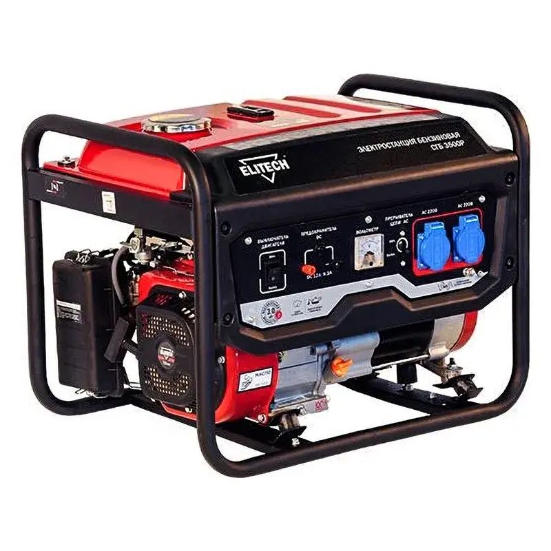 Бензиновый генератор ELITECH СГБ 3500 Р служит в качестве автономного источника электроэнергии переменного однофазного тока напряжением 220 В при проведении ремонтно-строительных работ или в аварийных ситуациях. Номинальная мощность 3 кВт обеспечивает питание осветительных приборов, бытовой техники или электроинструментов, в совокупности потребляющих 2,8 кВт. Допускается эксплуатация при температуре окружающего воздуха от -15°С до +40°С. Устройство работает от четырехтактного бензинового двигателя мощностью 7,5 л.с.
