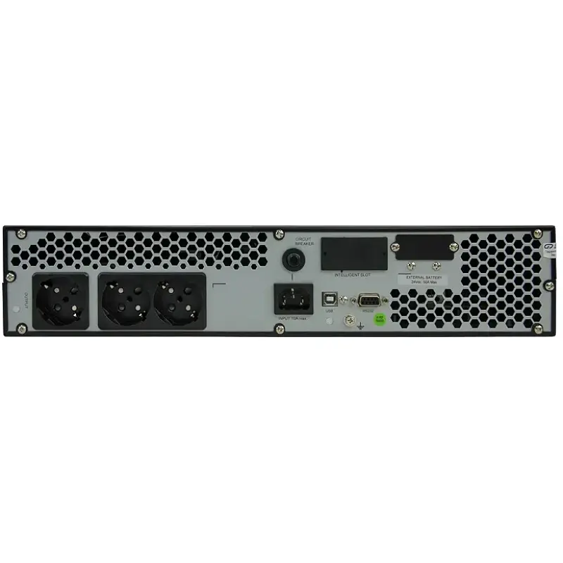 - Разъемы RS-232, USB служат для связи ИБП с компьютером, регистрации событий и мониторинга, настройки аварийных сигналов и безопасного отключения ИБП через компьютер. Порт EPO обеспечивает функцию аварийного дистанционного отключения.