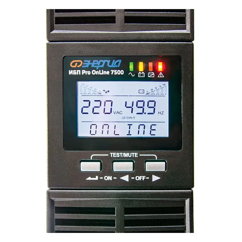 - LCD дисплей с кнопочным управлением. Индикация режима работы ИБП, входного/выходного напряжения, частоты, мощность нагрузки, температуры, заряд батарей, данные об ошибках и неисправности;