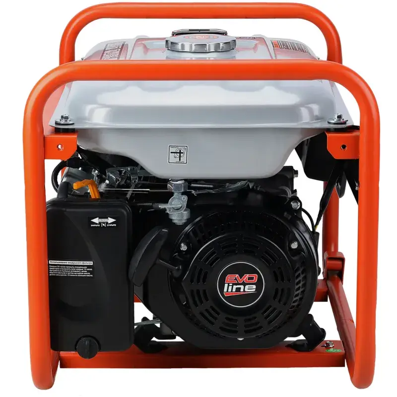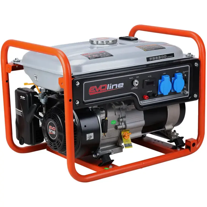 Однофазный бензиновый генератор EVOline PB 3300 открытого исполнения. Генератор оснащен топливным баком, объём 15 л. Силовым элементом генератора является двигатель GB210 мощностью 3 кВт. Также генератор оборудован регулятором напряжения AVR, который обеспечивает стабильное выходное напряжение. На корпусе бензогенератора установлено две розетки для подключения потребителей.