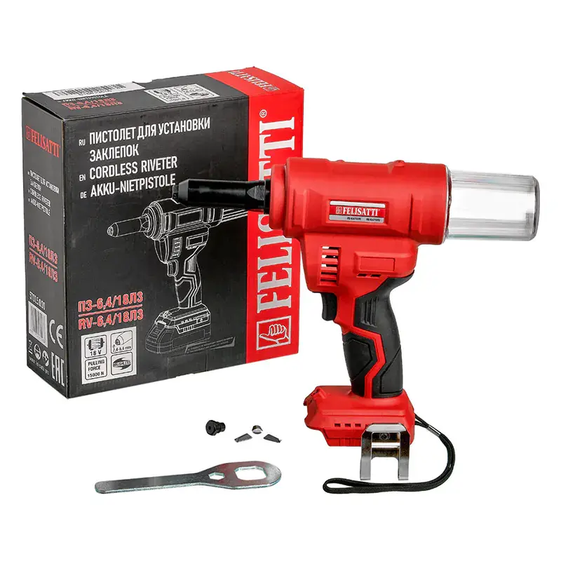 Несколько заклепок можно установить ручным заклепочником. В продаже имеются и сетевые электрические заклепочники. Но если у вас большой объем работы с заклепками в удаленных от источников электричества местах, например, крепление профлиста на садовом участке, или монтаж фасадов, то аккумуляторный пистолет для установки заклепок Felisatti ПЗ-6,4/18 Л3 для вас просто незаменим.