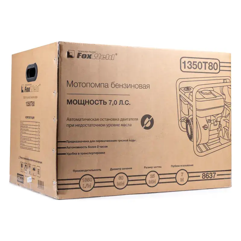 Усиленная рама покрыта двойным слоем краски и специальным защитным слоем для повышения износостойкости и срока службы устройства. Изготовленная из долговечного чугуна крыльчатка измельчает мусор и примеси, которые засасываются насосом, во избежание затора. В комплект поставки мотопомпы FoxWeld 1350T80 входит фильтр с отверстиями 25 мм, задерживающий крупные включения.