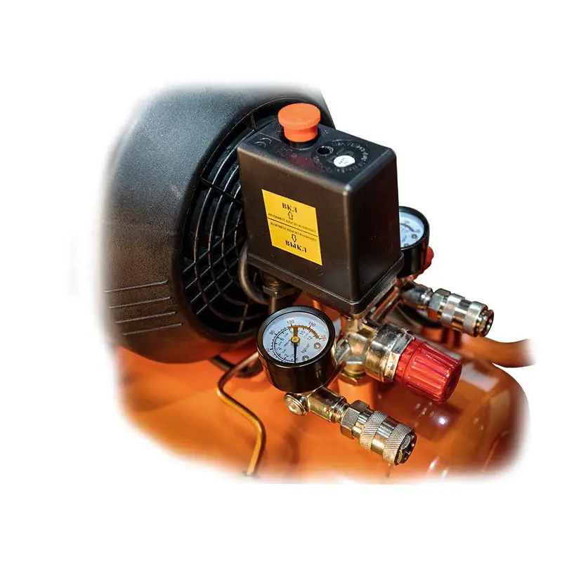 Вы можете регулировать давление на выходе в зависимости от технических характеристик подсоединенного пневматического инструмента. Давление в ресивере и на выходе удобно отслеживать с помощью двух манометров.