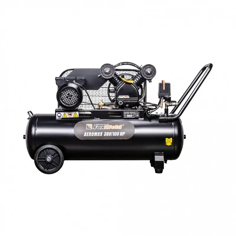Компрессор AEROMAX 380/100 HP — ременной компрессор с большой производительностью. Оснащен ресивером на 100 литров. Данный агрегат сконструирован на базе V-образной двухцилиндровой головки с ременным приводом, что обеспечивает высокий КПД при небольших оборотах (низком уровне шума) и долгий срок службы компрессора. Предусмотрена регулировка и визуальный контроль выходного давления за счет встроенных манометров и регулятора.
