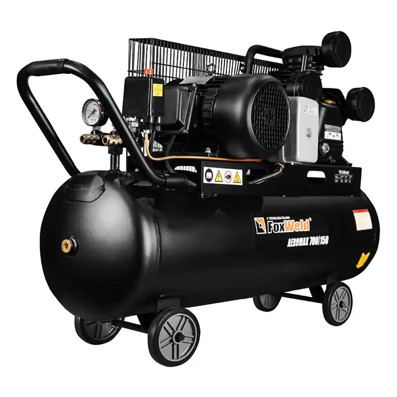 Масляный ременной компрессор FoxWeld AEROMAX 700/150 используется для сжатия атмосферного воздуха и подачи в качестве энергоносителя для пневмоприводов и пневмооборудования. Производительности 700 л/мин и давления до 8 бар достаточно для обеспечения работы плазмореза, отбойного молотка, гайковерта с высоким крутящим моментом, хоппер-ковша и других мощных пневмоинструментов.