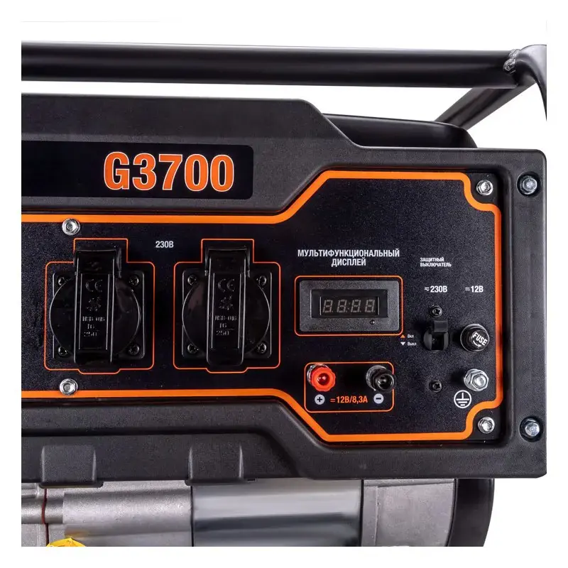 Текущие параметры работы бензогенератора FoxWeld Expert G3700 удобно отслеживать с цифрового дисплея. Экран показывает напряжение, частоту, а также счетчик моточасов.