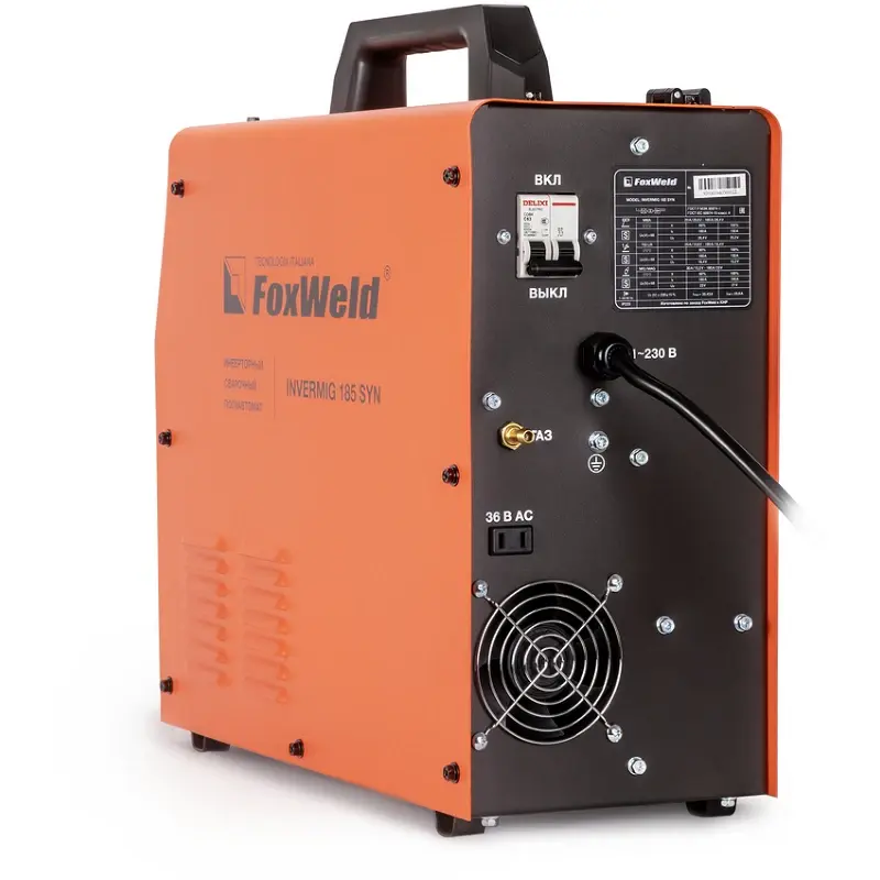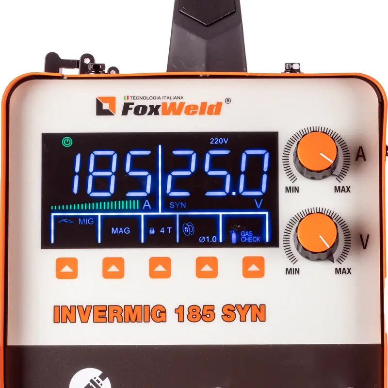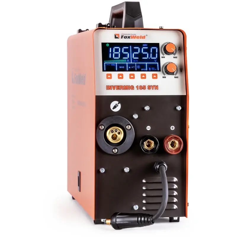 Многофункциональный сварочный полуавтомат FOXWELD INVERMIG 185 SYN с синергетическим режимом управления позволяет производить сварку постоянным током, используя инверторную технологию преобразования и управления сварочным током, что уменьшает габариты и вес по сравнению с традиционными трансформаторными полуавтоматами. С помощью этой модели можно проводить полуавтоматическую сварку (MIG/MAG) сплошной проволокой в среде защитного газа и самозащитной проволокой без использования защитного газа в ручном и синергетическом режимах, ручную дуговую сварку (ММА) на постоянном токе штучным покрытым электродом с рутиловым и основным покрытием и аргонодуговую сварку (ТIG LIFT) на постоянном токе с возбуждением дуги касанием вольфрамового электрода. Регулировка индуктивности позволяет вести процесс сварки с минимальным разбрызгиванием металла и приспосабливать процесс к любому типу работ. На задней панели расположена розетка 36 В для подключения подогревателя газа, который необходим для защиты обледенения редуктора во время продолжительной работы.