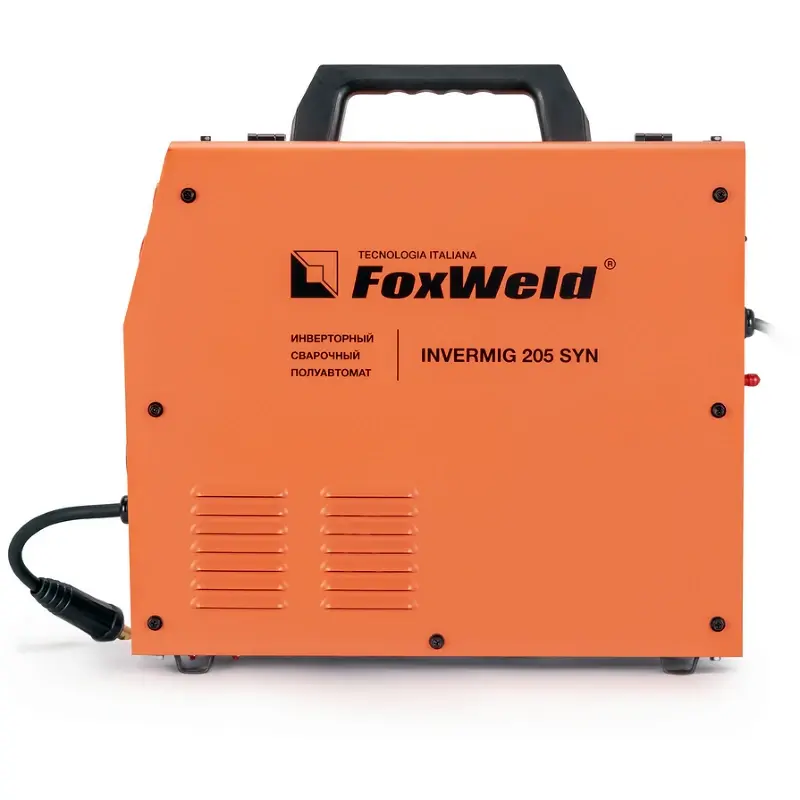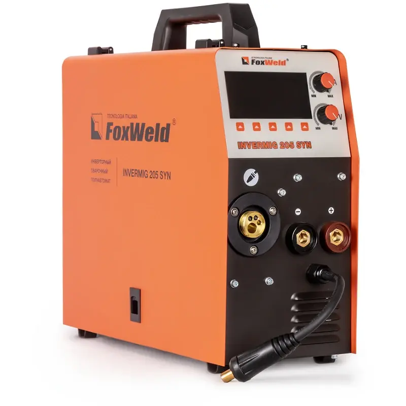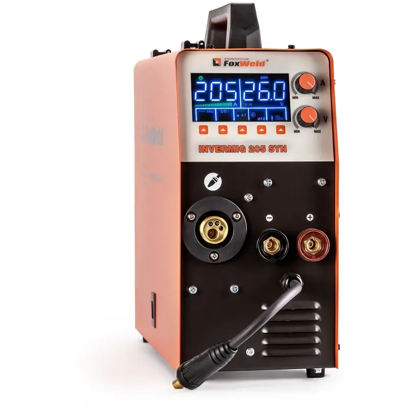 Многофункциональный сварочный полуавтомат FOXWELD INVERMIG 205 SYN с синергетическим режимом управления позволяет производить сварку постоянным током, используя инверторную технологию преобразования и управления сварочным током, что уменьшает габариты и вес по сравнению с традиционными трансформаторными полуавтоматами. С помощью этой модели можно проводить полуавтоматическую сварку (MIG/MAG) сплошной проволокой в среде защитного газа и самозащитной проволокой без использования защитного газа в ручном и синергетическом режимах, ручную дуговую сварку (ММА) на постоянном токе штучным покрытым электродом с рутиловым и основным покрытием и аргонодуговую сварку (ТIG LIFT) на постоянном токе с возбуждением дуги касанием вольфрамового электрода. Регулировка индуктивности позволяет вести процесс сварки с минимальным разбрызгиванием металла и приспосабливать процесс к любому типу работ. На задней панели расположена розетка 36 В для подключения подогревателя газа, который необходим для защиты обледенения редуктора во время продолжительной работы.