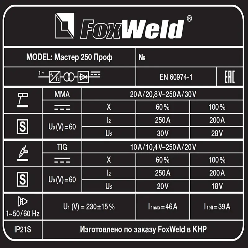 Сварочный аппарат FoxWeld Мастер 250 предназначен для работы в режимах MMA и TIG LIFT. К модели подходят электроды диаметром от 2 до 5 мм. Сварочный ток настраивается в диапазоне от 10 до 250 А в зависимости от выбранного режима работы.