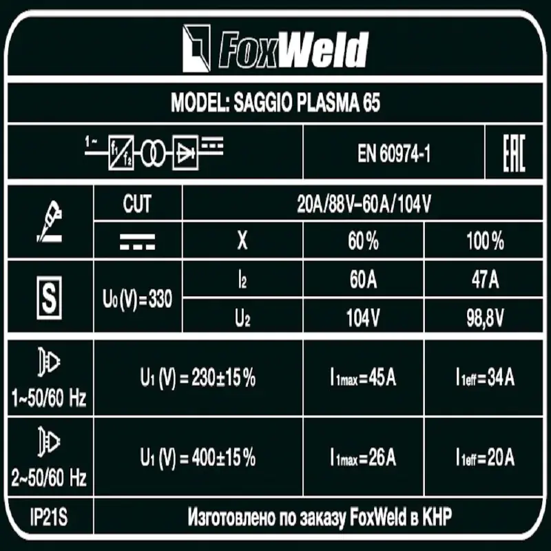 Аппарат плазменной резки FoxWeld SAGGIO PLASMA 65 может резать металл толщиной до 20 мм, а чистый рез составляет минимум 15 мм. Силу токи резки можно выставить в границах 20 – 60 Ампер. Чем больше сила тока резки, тем толще можно резать сплав металла. Значение напряжения резки вирируется от 88 до 104 Вольт.