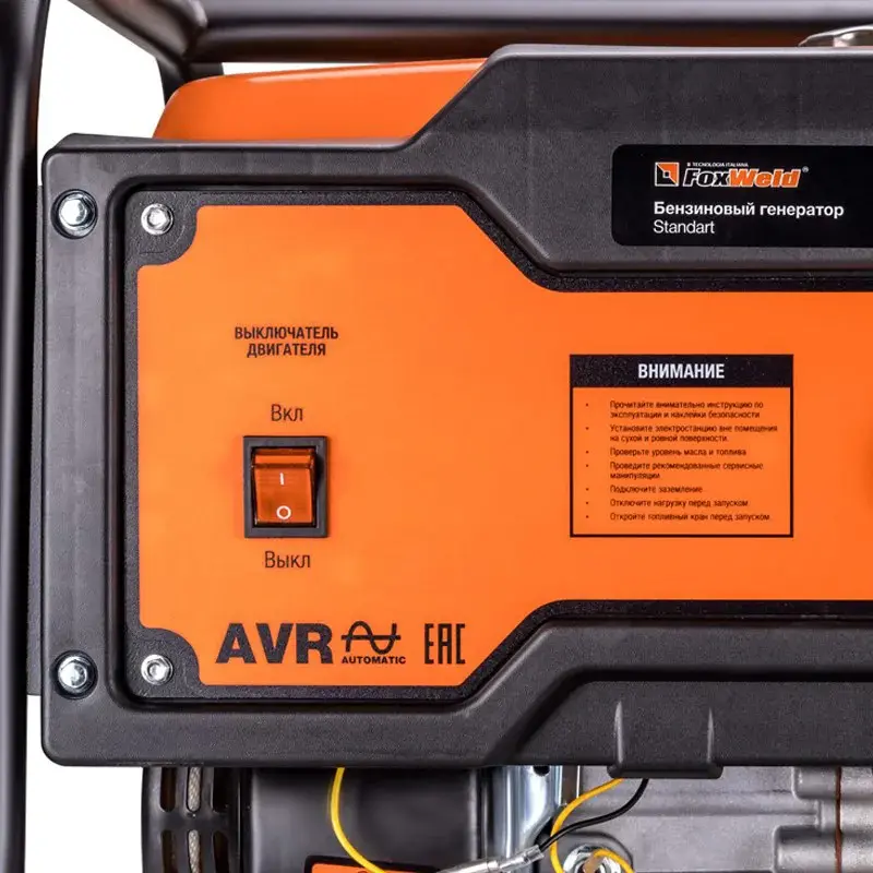 В бензогенераторе FoxWeld Standart G350 предусмотрен автоматический регулятор напряжения AVR. Он выравнивание показатели электросети, исключая внезапное отключение техники, которая питается от генератора. Это также бережет двигатель модели от перегрузки. Функция пригодится, если в помещении нестабильная электросеть.