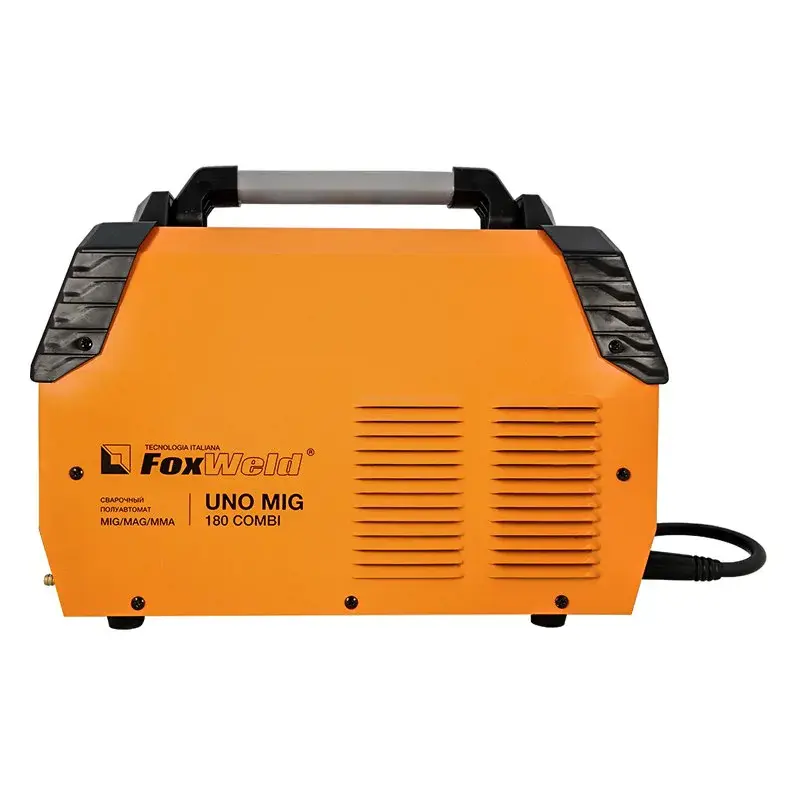 Сварочный полуавтомат FoxWeld UNO MIG 180 COMBI используется для варки изделий штучным электродом с покрытием или проволокой в среде защитного газа. Для гибкой настройки рабочих параметров предусмотрена регулировка напряжения от 16 до 25,6 В, индуктивности до 10, а также тока в диапазоне 20-180 А.