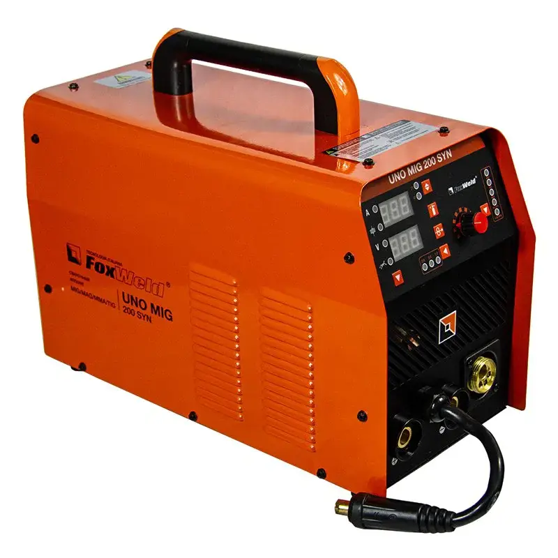 Сварочный полуавтомат FoxWeld UNO MIG 200 SYN используется для сварки металла штучным электродом с покрытием или проволокой в среде защитного газа. Для гибкой настройки рабочих параметров предусмотрена регулировка напряжения от 10,4 до 27,2 В, а также тока в диапазоне 10-200 А.