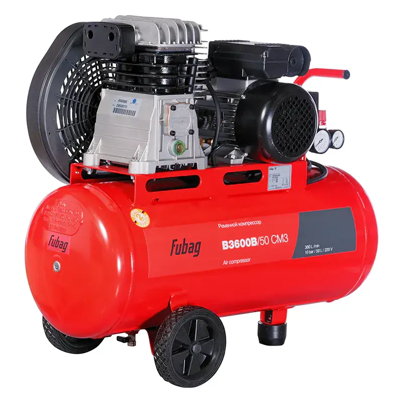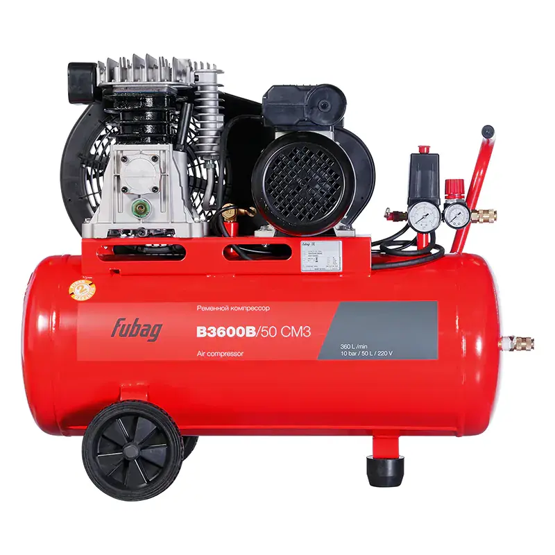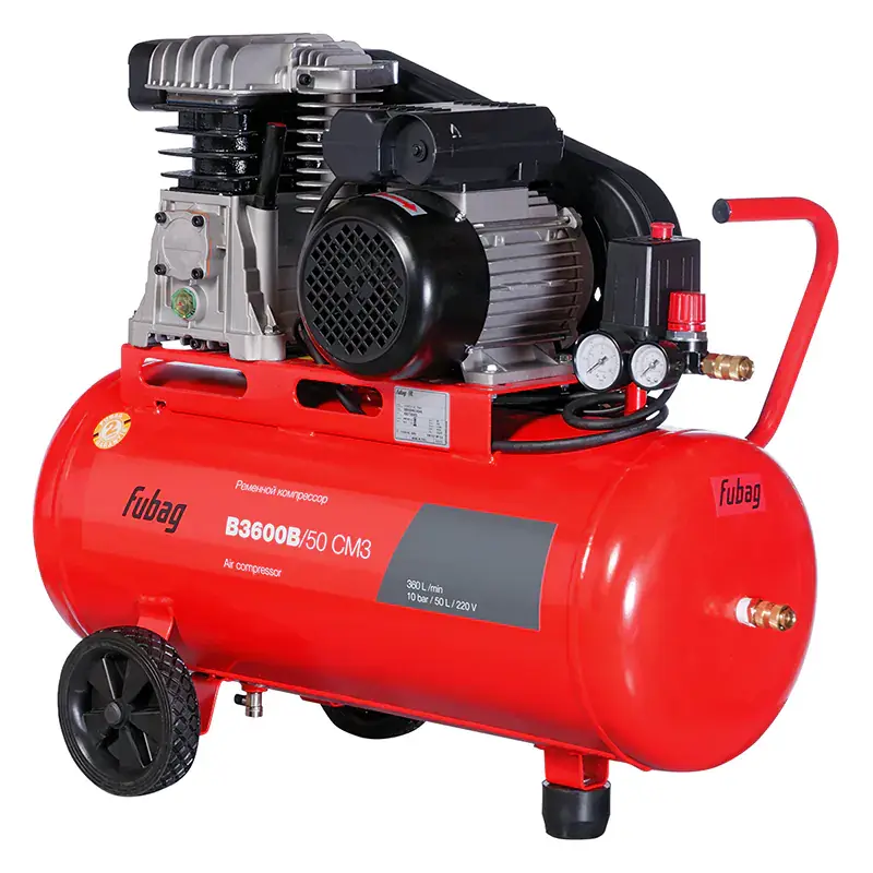 Поршневой масляный компрессор Fubag B3600B/50 CM3 с ресивером объемом 50 л нагнетает воздух с производительностью 360 л/мин. Для простого перемещения по рабочей площадке предусмотрены два колеса.