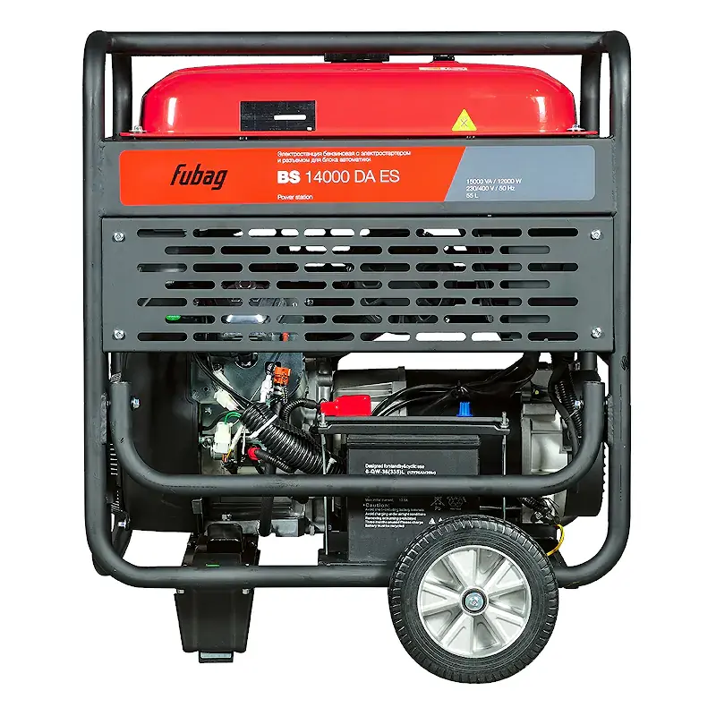 Бензиновый генератор Fubag BS 14000 DA ES – трехфазная модель с максимальной номинальной мощностью 12 кВт. Оснащена коннектором автоматики и электрическим стартером. Для простого перемещения по рабочей площадке генератор оснащен транспортировочными колесами и рукояткой.